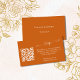 Personalize e adicione seus nomes, URL do site de casamento para seu próprio código QR e texto. Fundo cor de laranja queimado, texto branco.