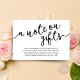 Celebre o início de sua jornada junto com o nosso elegante e rústico tema preto e branco moderno, criado "Uma nota sobre presentes" convite de casamento incluído, desejo, dinheiro. Apresentando uma sofisticada mistura de escrituras modernas e atração romântica, cada cartão é meticulosamente projetado para transmitir a essência do seu dia especial. Perfeitamente adequado para casais que buscam uma forma única de compartilhar seus sonhos de lua de mel, este cartão convida seus entes queridos a contribuir para experiências inesquecíveis. Seja aninhado em um envelope luxuoso ou apresentado ao lado de seus convites de casamento, nosso cartão adiciona um toque de encanto à sua celebração, prometendo memórias queridas que duram uma vida inteira. Projetado por TeeshaDerrick.