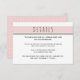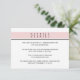 Cartão de inserção de detalhes de casamento rosa corado moderno. Ele apresenta a palavra "Detalhes" em uma fonte moderna em preto, uma faixa em rosa corado e uma linha preta. A parte traseira inclui um padrão geométrico em branco sobre rosa.