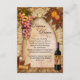 Alojamentos caseiros e direções ou cartão de informação do local de janto e dança, que inclui uma pintura tradicional com uvas, flores, folhas de outono, cortiça, pérolas e uma garrafa de vinho em madeira rústica em frente a um arco romano. Um belo cartão de inserção para uma festa que está em um local diferente da cerimônia de casamento ou para informações adicionais para seus convidados de casamento.