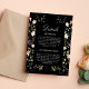 A "Carta de Detalhes do Casamento Negro de Flores Selvagens" foi projetada para fornecer informações essenciais com estilo e elegância. Apresentando flores silvestres delicadas contra um elegante pano de fundo preto, esta carta complementa lindamente a sua suíte de casamento enquanto oferece um toque moderno, mas inspirado na natureza. Perfeito para compartilhar detalhes, acomodações ou itinerários de locais, ele garante que seus hóspedes tenham tudo o que precisam para seu dia especial. Criada a partir de materiais de alta qualidade, esta carta combina a praticidade com um design espantoso para uma impressão duradoura.