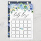 Bingo! Adicione este divertido jogo de bingo de chá de bebê ao seu evento. Ele apresenta uma guirlanda floral em aquarela de rosas azuis e hortênsias, rosas bege e folhagens. Personalize adicionando seus detalhes. Este cartão de jogo de bingo de chá de bebê floral é perfeito para chás de bebê de primavera e inverno. Itens correspondentes estão disponíveis.
