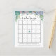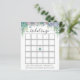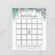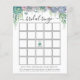 Cartão de bingo chá de panela com uma cascata de suculentos púrpura, verdes e azuis empoeirados, eucalipto e verde. Uma maneira divertida de interagir com os convidados do chá enquanto a futura noiva abre seus presentes.
