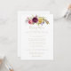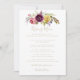 Este cartão de cardápio de beijos tropicais de boho-ouro é perfeito para uma recepção de casamento moderna. O design apresenta penas castanhas pintadas à mão, cor amarela-boho, branca, púrpura, rosa, pincel, flores borboletas e bagas azuis perfeitamente organizadas em belos buquês.