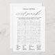 Torne o seu chá de panela um evento memorável e divertido com o nosso Cartão de Jogo de Pesquisa do Word para Chá de panela Elegante. Este jogo moderno e minimalista é a adição perfeita a qualquer celebração de casamento, proporcionando horas de diversão para a noiva e seus convidados. Nosso jogo de busca de palavras apresenta uma grade de letras onde você pode procurar por palavras relacionadas ao casamento. De "noiva" a "amor", este cartão de jogo está cheio de palavras que capturam a essência de um belo dia de casamento. Com palavras dispostas horizontalmente, verticalmente e diagonalmente, o desafio é encontrá-las todas! O elegante design do cartão de jogo adiciona um toque elegante ao decoro do chá de panela. O seu estilo minimalista alinha-se perfeitamente a uma estética moderna do chá de panela, fazer-a como uma peça de destaque na sua celebração. Quer você esteja hospedando uma pequena reunião ou uma grande festa, este jogo certamente engajará seus convidados e criará memórias duradouras. Nosso Cartão de Pesquisa do Word para Chás de panela Elegante não é apenas atraente visualmente; é também uma maneira divertida e interativa de entreter seus convidados. É um daqueles jogos de chá de panela divertidos que todos podem desfrutar, independentemente da idade ou do passado. Então junte seus amigos e família, e deixe a palavra busca começar! Não perca esse jogo de casamento. Adicione o nosso Cartão de Jogo de Pesquisa do Word para Chá de panela Elegante aos seus planos de chá de panela e faça dele um evento para se lembrar. Prepare-se para risos, entusiasmos e competição amigável enquanto celebra os próximos núpcias em estilo.