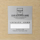 Cartão de fidelidade personalizável de duas vezes com espaço para o nome de seus clientes leais. A cor é cinza. A cor da fonte é preta. Para personalizar este cartão de fidelidade, carregue o logotipo da sua empresa, digite o nome da sua empresa ou empresa, endereço, número de telefone, email, site ou página de mídia social e data de validade deste cartão de fidelidade. Verifique a aparência após carregar o logotipo e digitar textos. Se a aparência lhe agrada, você pode colocar seu pedido agora. Se você precisar redimensionar e mover o logotipo e os textos para o ajustado neste cartão de fidelidade ou em outros estilos que você escolher, mude na ferramenta design. Você também pode fazer outras alterações de acordo com sua preferência na ferramenta design, como alterar a cor da placa, a cor da fonte, o estilo da fonte, adicionar imagem, editar textos, adicionar textos e excluir textos. Cartão de fidelidade para seus clientes convencê-los a comprar novamente em sua loja ou retornar em seu compro para poder usar seu serviço.