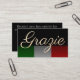 Este cartão de fidelidade do restaurante de clientes apresenta um tema italiano elegante. "Grazie" é impresso na frente em uma bela fonte dourada. Grazie significa "Obrigado" na Itália. Uma bandeira italiana esmaecida é colocada sobre um fundo negro. No verso é impressa uma mensagem de exemplo para ganhar uma entrada grátis ou item de refeição, seguida do nome do restaurante e das informações de contato no fundo. Os círculos indicam onde um funcionário poderia carimbar o cartão para cada item elegível. É perfeito para estabelecimentos que servem pizza e subs, ou entradas sofisticadas.