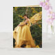Uma fada querido em amarelo descansa num campo de margaridas florestais.
