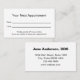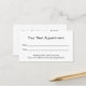 Este cartão profissional de dentista é de dupla face. O lado um diz "Seu Próximo Compromisso" e tem linhas para a data e hora do compromisso. Na parte inferior, há texto de exibição que você pode editar para criar uma mensagem personalizada, se desejar. (Mostrado: Tenha gentilmente 24 horas de antecedência se não conseguir manter seu compromisso.) O lado dois tem texto para ser substituído pelo nome (ou nome da prática) do dentista e seu endereço, número de telefone e site. Todo o texto pode ser editado ou excluído. O texto é preto.