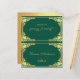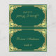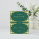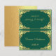 Um cartão de lugar de casamento vintage verde e dourado com o nome do convidado e o número da mesa impressos na frente e os nomes dos noivos e a data do casamento impressos no verso (isto é, a outra metade, antes de dobrá-lo). Possui uma moldura antiga com decorações de folha de ouro falsa e também ouro falso no interior (no verso, antes de dobrá-lo). Todo o texto é dourado, escrito em caligrafia elegante. O fundo é verde esmeralda.