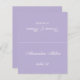 Um simples cartão de lugar de lavanda (roxo claro) com o nome do convidado e o número da mesa impressos em sua frente, os nomes da noiva e do noivo e a data de casamento impressa no outro lado (ou seja, a outra metade, antes de dobrá-la). Todo texto é um script caligráfico branco. Tamanho: 4,5" x 5,6" antes da dobragem, ou seja, 4,5" x 2,8" após a dobragem.