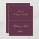 Um simples cartão de casamento com cor de vinho e texto de ouro. O nome do convidado e o número da tabela impressos na sua frente, os nomes da noiva e do noivo e a data do casamento impressos no outro lado (ou seja, a outra metade, antes de dobrá-la). Todo texto é um script caligráfico de ouro. Tamanho: 4,5" x 5,6" antes da dobragem, ou seja, 4,5" x 2,8" após a dobragem.