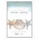 Projetado para combinar com minha coleção de casamento Starfish Sea, este é um cartão de local perfeito para um casamento náutico ou com tema de praia. A frente apresenta estrelas-do-mar em aquarela e uma concha com modelos de texto para digitar nomes e números de mesa. O verso apresenta os nomes dos noivos e a data do casamento acentuados por ondas do oceano pintadas à mão. O interior do cartão é azul porto.