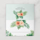 Belo design de carta de casamento com flores aquáticas e folhagem em fundo branco na frente e fundo verde de menta no fundo.