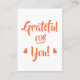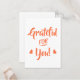 Coloque um tom quente e acolhedor na sua mesa de feriado com este cartão de Dia de Ação de Graças com a frase escrita Grateful You! em um roteiro laranja ousado. Uma maneira perfeita de mostrar apreço à família, amigos e convidados durante o janto de Ação de Graças, Ação de Amizade ou qualquer reunião de outono. Adiciona um toque sincero ao entretenimento sazonal.