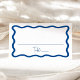 Adicione um toque de na moda à sua recepção de casamento ou evento especial com os cartões de casamento do Modern Wavy Frame! O design retrovisor exibe "Mesa" em um script azul manuscrito com espaço para você escrever o nome do convidado e o número da tabela. Uma borda ondulada azul envolve o design contrastando com um fundo branco. A parte de trás do cartão de lugar liso mostra seus nomes e data de casamento em letras brancas em negrito.
