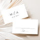 Cartões modernos de núpcias com roteiro de caligrafia em branco. A parte de trás dos cartões de lugar preto e branco apresenta suas iniciais de monograma com sua data de casamento mostrada abaixo. As elegantes cartas de roteiro são perfeitas para recepções de casamento modernas, jantas de ensaio e outros eventos especiais.