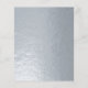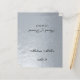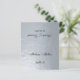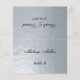 Um cartão de casamento com lugar em prata falsa com o nome do convidado e número da mesa impressos na frente e os nomes da noiva e do noivo e a data do casamento impressos no verso (isto é, a outra metade, antes de dobrar). Todo o texto está em script caligráfico preto.