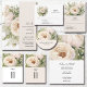 Nossa bela e moderna suíte de convite de casamento apresenta rosas brancas, flores e folhagens elegantes. Este convite de casamento simples e elegante é perfeito para o seu dia especial. Os buquês de flores brancas são clássicos e atemporais, e nossa suíte de convites inclui todos os elementos essenciais que você precisa para criar uma primeira impressão impressionante.