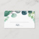 Este magro cartão de casamento verde e eucalipto é perfeito para uma elegante recepção de casamento de quintal. O design botânico moderno apresenta um belo eucalipto azul-aquarela e folhas verdes. Personalize a parte de trás das cartas com os nomes da noiva e do noivo e a data. Compre em massa e escreva os nomes de convidado e os números de tabela nos cartões impressos quando eles chegarem.
