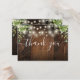 Uma corda elegante ilumina madeira rustica com obrigado de casamento verde, com cartão de recepção, personalizado com uma mensagem especial e os nomes da noiva e do noivo. Projetado por Thisnotme©