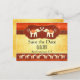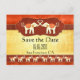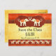 Um adorável cartão de Marcação de Data romântico com dois elefantes de cor de marfim apaixonados, aclamados por suas tribos. O fundo é um design texturizado em vermelho burgundy quente e ocre com toques de dourado e dourado rosado. Lindíssimo se você está planejando um casamento inspirado na Índia, África, zoológico ou estilo safari.
