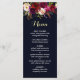 Cartão de cardápio de casamento do estilo boêmico com ilustração aquosa de peões e rosas com sotaque de burgundy, vermelha e rosa com penas. Itens correspondentes também estão disponíveis. Clique no botão "Personalizar" para alterar fontes, tamanhos e cores.