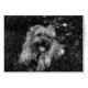 uma fotografia a preto e branco de um cão muito feliz deitado na grama na sombra.