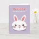 Este cartão apresenta uma cabeça estilizada de coelho branco apoiada na parte inferior do design, contra um fundo suave de lavanda 🌷. O coelho tem orelhas eretas com detalhes internos cor-de-rosa, olhos pequenos pretos, um narizinho rosa e bochechas rosadas arredondadas que lhe dão um olhar terno e amigável, como se estivesse inclinado para um doce cumprimento. Acima do coelho, uma mensagem de duas linhas está situada na metade superior, com a primeira linha em letras coral e a segunda linha em letras brancas para um contraste suave. As formas arredondadas das letras parecem suaves e afetuosas, ecoando a expressão calma do coelho e adicionando um tom aconchegante e íntimo 🐰. Linhas finas de bigodes e uma pequena boca curvada adicionam um toque de calor, como se o coelho estivesse sorrindo silenciosamente para alguém especial. Uma sombra tênue sob a cabeça do coelho ajuda a destacá-la do fundo sem adicionar bordas ásperas. O texto coral está cent