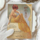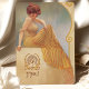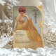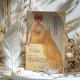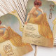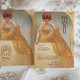 Mergulhe seus hóspedes no charme vintage com este cartão de menu elegante inspirado em Art Nouveau. Apresentando uma mulher graciosa em um vestido amarelo que flui, colocado contra um pano de fundo macio e ouro enfeitado com intrincadas espirais, este design irradia sofisticação e calor. O texto é lindamente estilizado para complementar o trabalho de arte, listando um menu elegante. Perfeito para casamentos, aniversários, ou eventos de escala superior, esta carta é uma mistura requintada de elegância clássica e talento artístico.