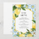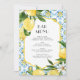 Este cartão de menu de limão personalizável apresenta limões de cor d'água, verde e um padrão de azulejo mediterrânico. Personalize adicionando uma escolha de data e refeição. Este cartão de menu de limão é perfeito para casamentos de verão, chás de fraldas, chás de panela, aniversários e muito mais.