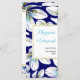 O foco deste cartão de menu de casamento são flores brancas deslumbrantes com detalhes em folha de aqua e dourado. A sua redação está numa faixa branca no lado direito. É uma escolha perfeita para um casamento tropical de verão. Note que não há folha de ouro real.