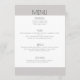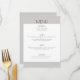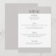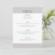 Apresentamos nosso cartão de menu personalizável e elegante, projetado para o casal moderno que busca elegância e simplicidade. Este cartão lindamente elaborado apresenta uma aparência limpa e sofisticada. Tons cinza suave na parte superior e inferior para um visual nítido em uma toalha de mesa branca. Espaço para quatro títulos diferentes e texto abaixo para mais detalhes do menu para o seu dia especial. Perfeito para uma solução de buffet ou estação de comida.