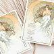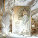 Este cartão de cardápio de casamento Art Nouveau, maravilhosamente trabalhado, irradia elegância e charme. A design apresenta uma figura graciosa rodeada por intrincados padrões circulares em tons de ouro e pêssego macio, com acentos de verde-menta mudo e marfim. As delicadas linhas florais e as linhas fluidas características do estilo Art Nouveau acrescentam um toque romântico e etéreo. O verso complementa o trabalho de arte com um layout detalhado de menus, perfeito para casamentos inspirados em vintage, românticos ou de temas pastel. Os detalhes intrincados e a paleta harmoniosa de cores fazem deste cartão de menu um eterno para a celebração do casamento.