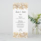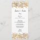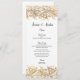 Design de folha de rendas de ouro antiga e elegante cria esta placa de menu exclusiva de recepção de casamento de boho vintage. Personalizável com nomes de noiva e noivo e cursos e opções de janto. Convite de correspondência, rsvp, banda de barriga, adesivos, obrigado de etiquetas e muito mais disponível.