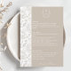 Cartão de Menu de Casamento de Pale Taupe Monograma Crest: crista monograma de arte de linha inspirada em vinheta com tipografia elegante. Apresenta um padrão floral de chinoiserie no verso e no lado para sofisticação do eterno. Digite a opção da ferramenta design se forem necessários ajustes quando o texto do menu for adicionado.