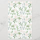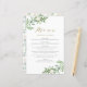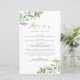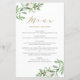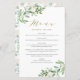 Adicione um sotaque de verdura à decoração da sua mesa com este cartão de menu personalizável. Ele apresenta ilustrações em aquarela e padrão de folhagem e flores brancas. Este cartão de menu floral é perfeito para casamentos de primavera e jardim e outros eventos.