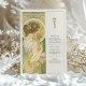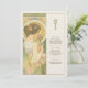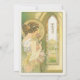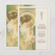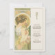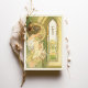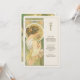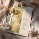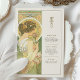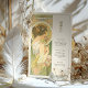 Dê elegância ao seu eterno de casamento com um cartão de cardápio inspirado em Art Nouveau, com uma mulher graciosa em um cenário sereno, semelhante a jardim. Com uma paleta de verduras suaves, ouros amarelos e cremes quentes, esta carta evoca uma sensação de romance e charme de safra. Os padrões florais detalhados, intrincada janela de vidro manchado, e traje delicado da mulher refletem o estilo e a sofisticação da era Art Nouveau, criando uma bela adição a qualquer tema de casamento que abraça a natureza e a beleza clássica. O verso do cartão apresenta o menu num formato elegante com tipografia refinada, melhorando a experiência artística. Este cartão é perfeito para um casamento vintage, jardim ou romântico.