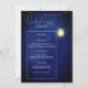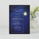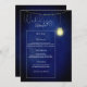 Menus correspondentes para o tema de casamento azul meia-noite, com recurso de pote de pedra e luzes de corda e tipografia branca definida de um lado para um visual muito elegante.