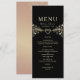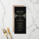 Adicione sofisticação ao seu reception com este cartão de menu de casamento preto e dourado, apresentando renda floral romântica e um coração de corda característico. Este design elegante combina perfeitamente com ambientes de jantar formal e combina com todo o conjunto de convites perfeitamente.
