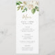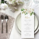 Cartões de cardápio impressos. Use as ferramentas de design para personalizar o layout, as cores de fundo e o texto com os detalhes do menu de casamento. Este elegante design apresenta um buquê floral de cor d'água em verde e branco com sotaques falsos de folha de ouro.