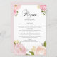 Adicione um sotaque floral feminino à capa de mesa do seu evento com este cartão de menu personalizável. Apresenta ilustrações de cor d'água de rosas e peônias cor-de-rosa, hálito e folhagem do bebê. Este cartão floral cor-de-rosa é perfeito para casamentos, chás de panela, chás de fraldas e aniversários. Personalize adicionando nomes, data e detalhes do menu.