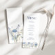 Aumente sua recepção de casamento com nosso Cartão de Menu de Casamento de Prados Azul-Vazio. Este elegante cardápio apresenta um belo design de aquarela de flores silvestres azuis francesas, incluindo as hydrangeas e os morangos, arranjados num padrão sereno de prados. A design suave e inspirada na natureza se emparelha perfeitamente com casamentos de jardim, rústicos ou de temas bóticos. Personalizável com seus itens de menu e detalhes personalizados de casamento, este cartão não só adiciona charme às configurações de sua mesa, como também permite que os convidados desfrutem de uma prévia na moda da refeição deliciosa à frente. Uma adição perfeita à sua decoração de recepção de casamento.