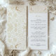 Este cardápio de casamento é uma banquete para os olhos, desenhada com um talento vitoriano que complementa a elegância do dia do casamento. A parte superior do cartão está alinhada com o design eterno de aves ouros e padrões florais vitorianos, colocados contra um fundo de creme mole. O menu em si é apresentado em uma fonte clássica, fácil de ler, detalhando uma seleção sumptuosa de aperitivos, cursos principais e sobremesas. Este cartão não é apenas um guia para os prazeres culinários que esperam, mas também um belo guardião que encarna o charme e a sofisticação da ocasião.