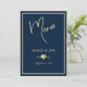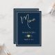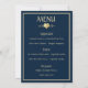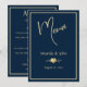 Um cartão de menu de casamento clássico em azul-marinho e dourado, projetado com texto em cor dourada, bordas e um acento em forma de coração, sobre um fundo azul-marinho escuro. Para personalizar este cartão elegante, basta inserir o nome do noivo e da noiva, a data do casamento e as seleções do seu menu de casamento em nosso modelo fácil, substituindo o texto de exemplo. Certifique-se de ver os acessórios de recepção correspondentes, incluindo: o cartão de mesa de casamento, cartão de lugar, livro de visitas de casamento e banner.