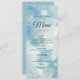 Adicione um toque mágico às suas mesas de recepção com este menu de casamento no inverno congelado em azul empoeirado. Com elegantes flocos de neve com aquarela, um coração romântico de corda prateada, e uma tipografia refinada com script, esta carta apresenta lindamente suas seleções de refeições. Perfeito para casamentos no inverno formais, recepções de férias ou eventos de neves.