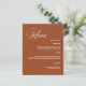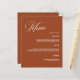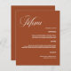 Fundo cor de laranja queimado. Personalize e adicione seus nomes, data e menu. Texto branco. 1 folha = 1 menu impresso borda a borda.