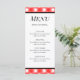 Um cartão de menu personalizado para aniversários, CHURRASCOS, comemorações ou restaurantes com letras de bloco em um padrão retro vermelho e branco marcado com faixas largas e finas, você pode personalizar este design para adicionar seu próprio logotipo, mudar fontes e até mesmo salvar seu design para mais tarde.