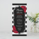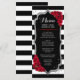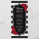 Cartão de Menu. Design preto branco vermelho sofisticado com brilho falso prateado. Listras pretas e brancas com rosas vermelhas. Perfeito para uma festa elegante.