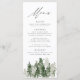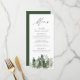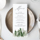 Cartão de menu personalizado elegante que apresenta os detalhes do menu de casamento no topo do menu com uma floresta de caçador escuro verde e pinheiros aquíferos salgados no fundo. O menu se reverte para um fundo verde-caçador escuro com espaço para texto e fotos. Projetado para coordenar com a nossa coleção de casamento Rustic Pine Forest.